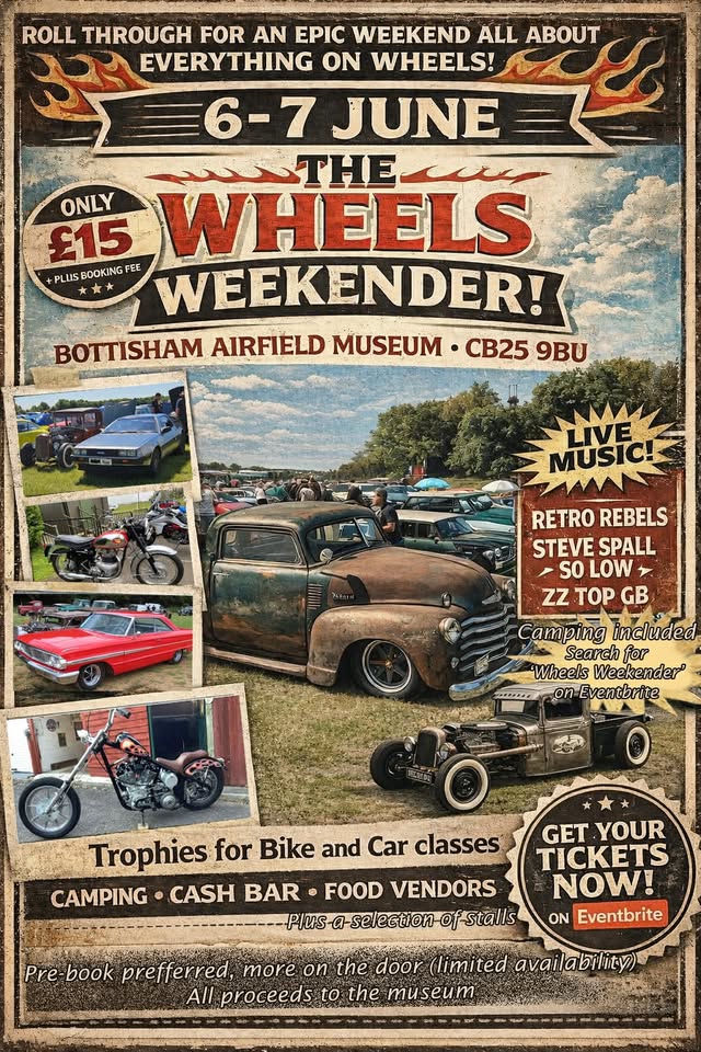 There will be live music into the evening from the Retro Rebels, Steve Spall So Low and ZZ Top GB as well as a cash bar and food vendors, plus trade stalls.